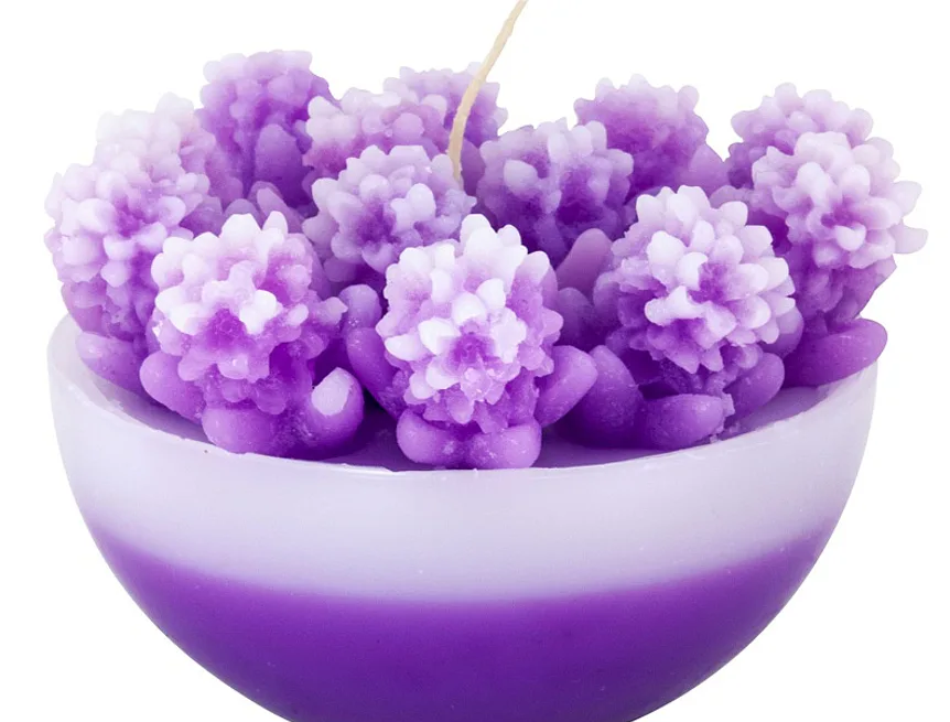 Originální, ručně vyráběná svíčka ve tvaru misky s drobnými kvítečky v odstínu fialkové barvy je skvělým tipem na dárek pro každou romantickou duši. Svíčka je dodávána v průhledném dárkovém balení.