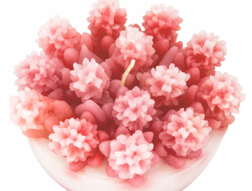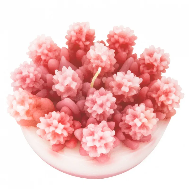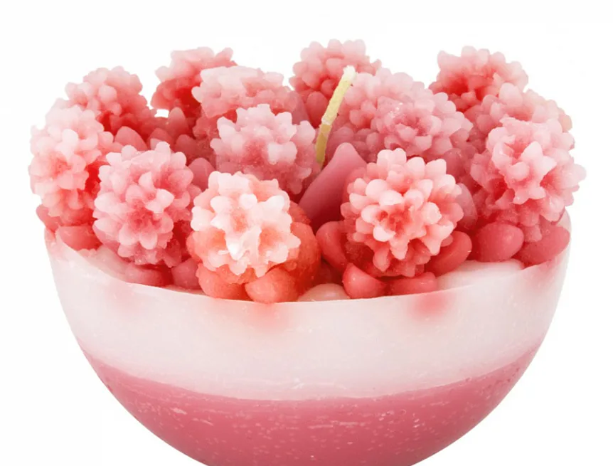 Originální, ručně vyráběná svíčka ve tvaru misky s drobnými kvítečky v pastelovém odstínu lososové barvy je skvělým tipem na dárek pro každou romantickou duši. Svíčka je dodávána v průhledném dárkovém balení.