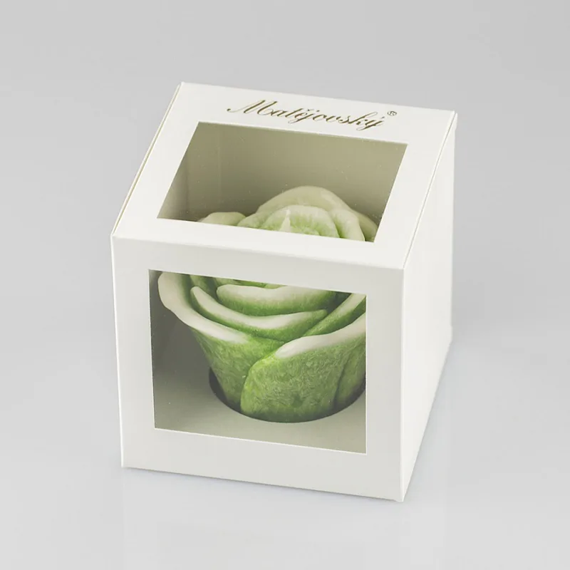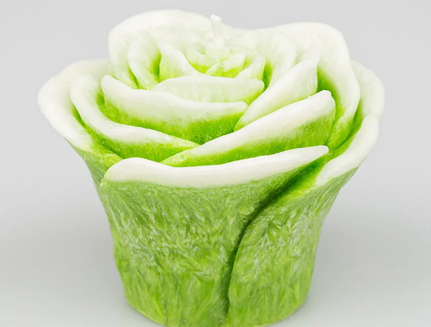 Ručně vyráběná svíčka ve tvaru květu růže v barvě zelené, s jemnou mramorovanou texturou je skvělým tipem na dárek pro každou romantickou duši. Květinová svíčka je vyrobena z kvalitního palmového vosku s jedním bavlněným knotem, odhořívá plynule a nekouří. Originální vzhled svíčky je doplněn sladkou ovocnou vůní, která se uvolňuje hořením.