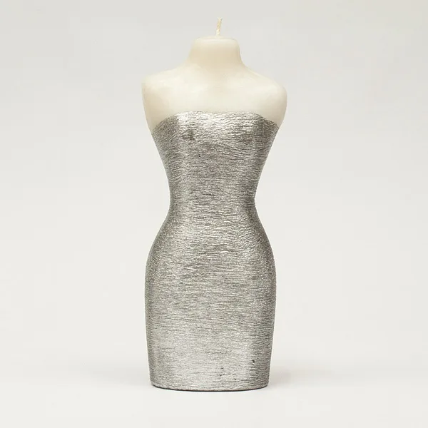 Bílostříbrná svíčka s jedním knotem má tvar ženské siluety o šířce 9 cm a výšce 23 cm.