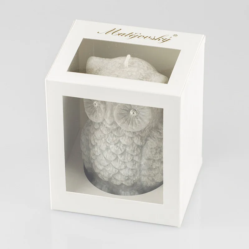 Ručně vyráběná svíčka ve tvaru sovičky v pastelovém odstínu šedé barvy s jemnou mramorovanou texturou je skvělým tipem na originální dárek. Svíčka zdobená kamínky Swarovski je vyrobena z kvalitního palmového vosku a má jeden bavlněný knot. Trendy vzhled svíčky je doplněn sladkou ovocnou vůní. Dodáváme v elegantní dárkové krabičce.