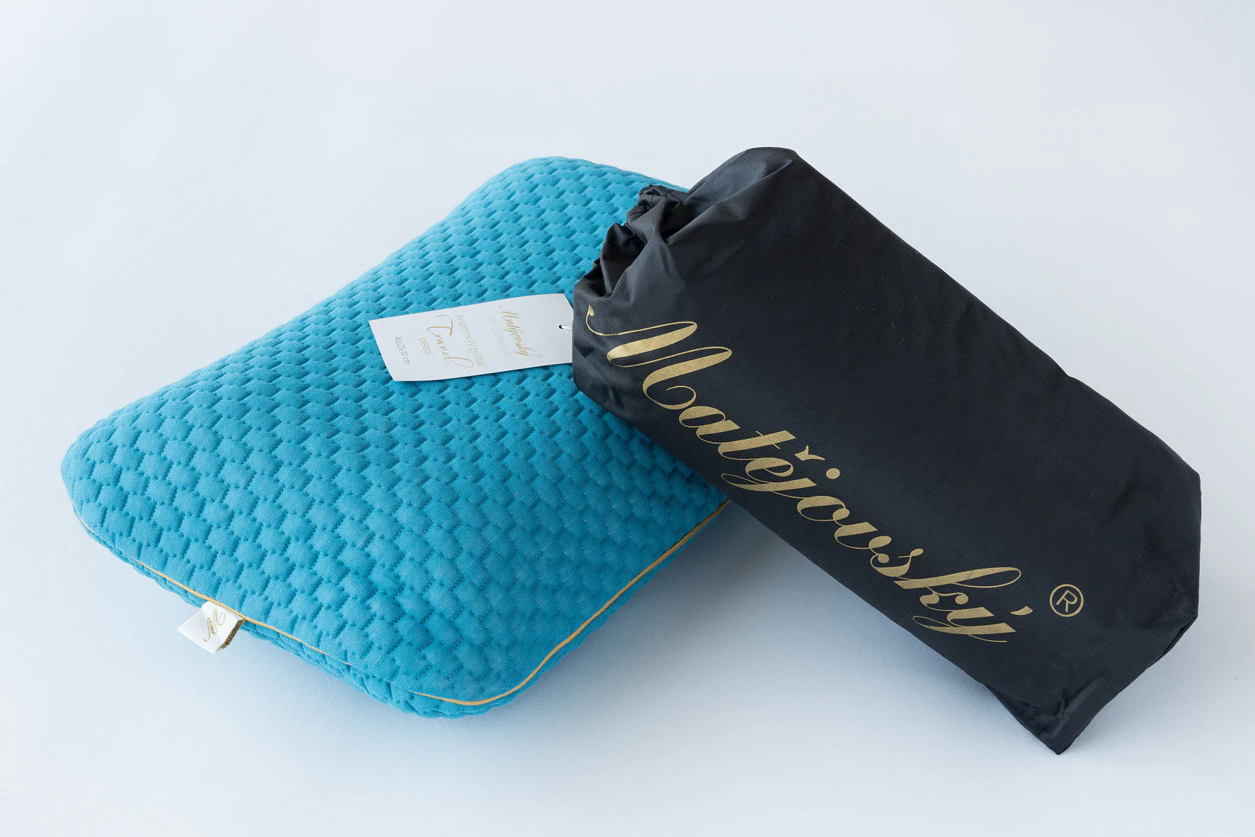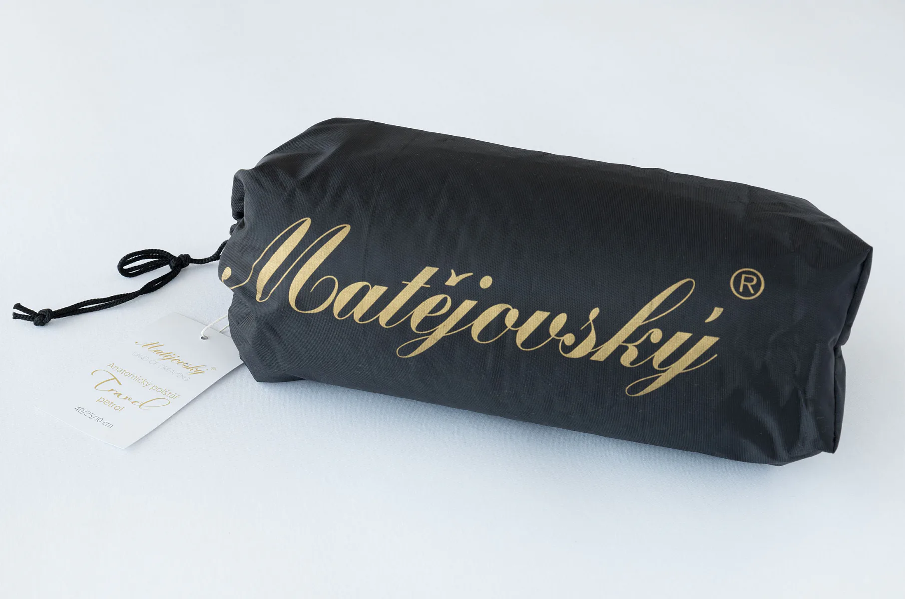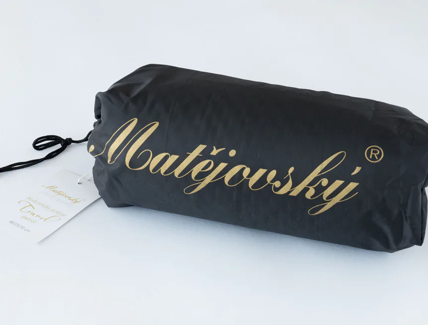 Balení: Anatomický polštář je balený v praktickém cestovním sáčku černé barvy s logem Matějovský.