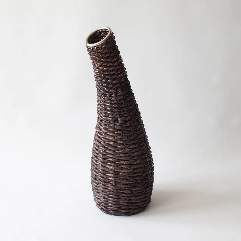 Krásná proutěná váza ozdobí jak klasický, tak moderní interiér. Váza má tmavě hnědou lesklou barvu, hrdlo je lemováno kovovým kroužkem.