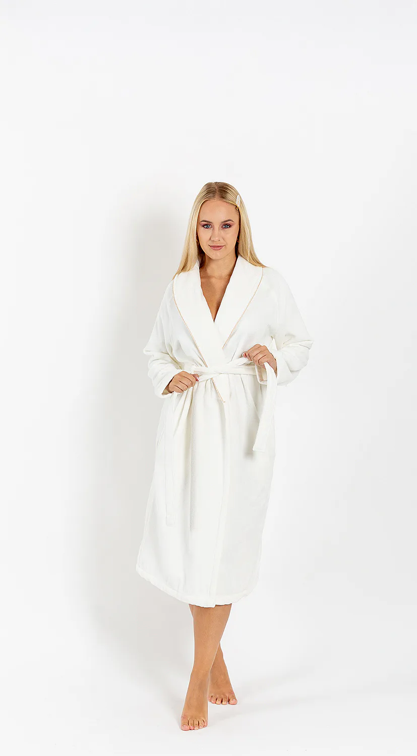 Župany jsou vyrobeny ze 100% prvotřídní bavlněné příze, povrchovou úpravu tvoří hebké velurové froté. Přírodní materiál je zárukou jedinečného komfortu, precizní zpracování zaručí dlouhou životnost výrobku. Elegantní vzhled celé kolekce podtrhují jemné pastelové barvy doplněné v čelním lemu zlatavou paspulí.