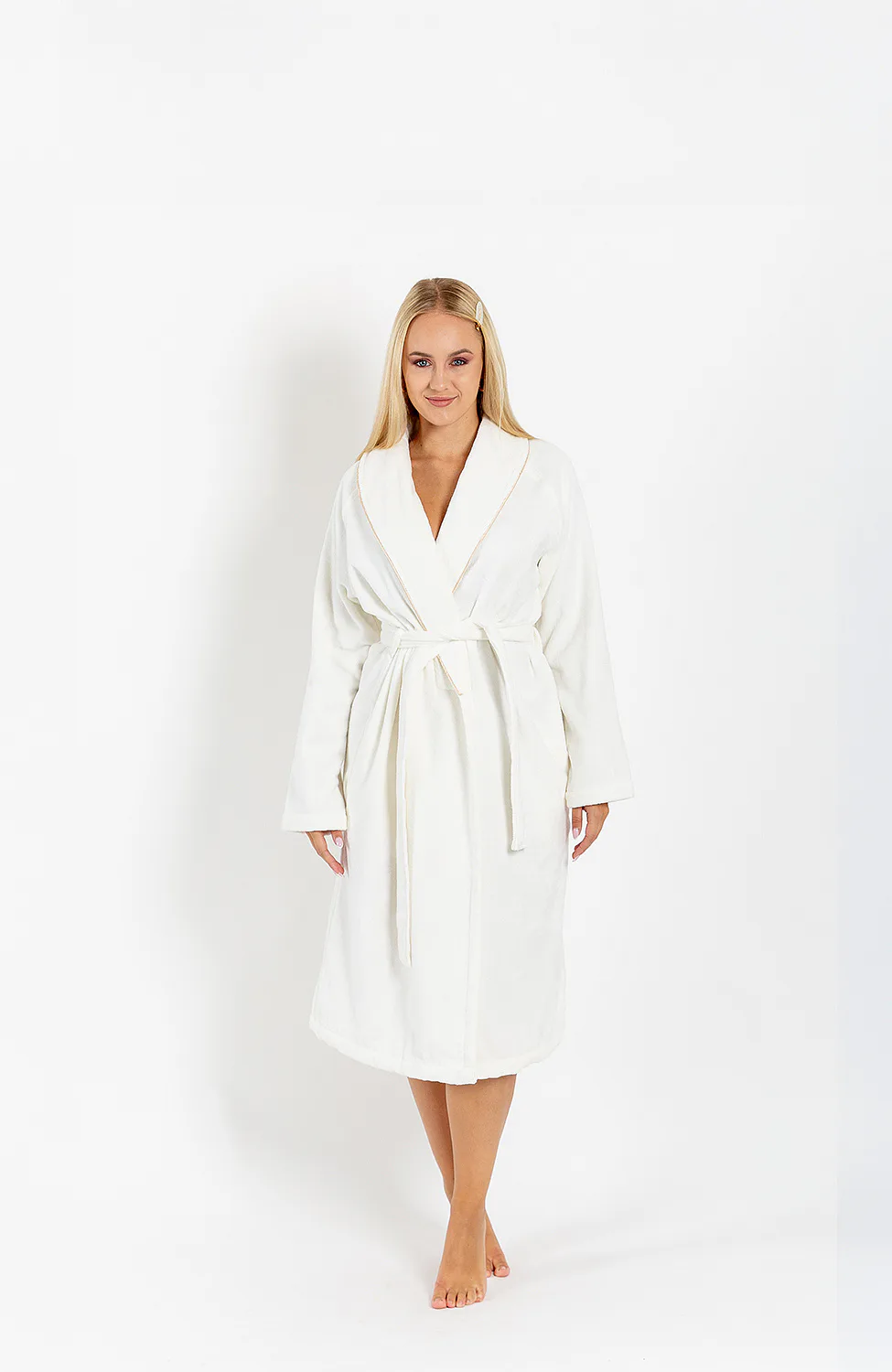 Župany jsou vyrobeny ze 100% prvotřídní bavlněné příze, povrchovou úpravu tvoří hebké velurové froté. Přírodní materiál je zárukou jedinečného komfortu, precizní zpracování zaručí dlouhou životnost výrobku. Elegantní vzhled celé kolekce podtrhují jemné pastelové barvy doplněné v čelním lemu zlatavou paspulí.